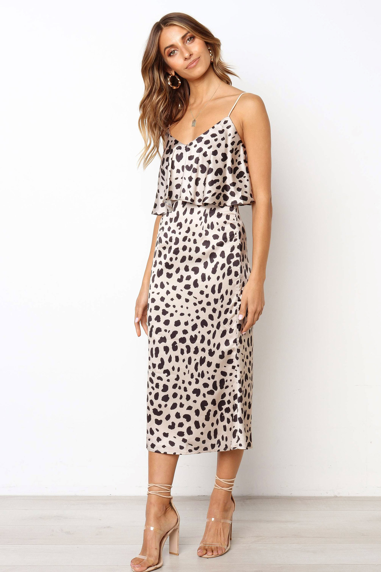 Σατεν εξωμο midi φορεμα απο λεπτο υφασμα με μεταξενια υφη ιδανικο για βραδινες εξοδους. Εχει πολυ θηλυκο πατρον που εφαρμοζει στο σωμα, λεπτες τιραντες και διπλο υφασμα που πεφτει αναλαφρα στο στηθος. Κλεινει πισω στην πλατη με κρυφο φερμουαρ και ειναι φοδραρισμενο στα σημεια που ειναι απαραιτητο απο λεπτο υφασμα. Spring-Summer collection. Συνθεση: 100% PES.