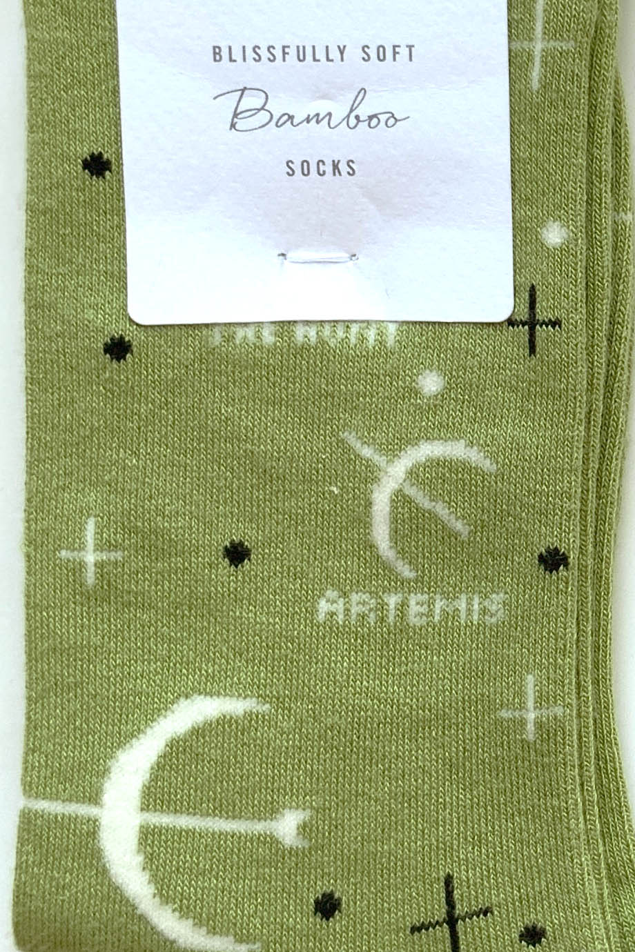 Καλτσες γυναικειες απο απιστευτα απαλο μπαμπου, πιστοποιημενο οργανικο βαμβακι και ανακυκλωμενο πολυεστερ με ζακαρ σχεδιο Artemis Goddess of the Hunt σε ανοιχτο πρασινο. Οι βιωσιμες καλτσες ειναι φυσικα αντιβακτηριδιακες και αντιμυκητιακες, επιτρεπουν στο δερμα να αναπνεει και ειναι φιλικες για τα ποδια αλλα και για τον πλανητη μας. Ειναι ελαστικες, one size για μεγεθος παπουτσιου απο 37 εως 41. Συνθεση: 54% Viscose που προερχεται απο Μπαμπου, 22% Πιστοποιημενο Οργανικο Βαμβακι, 22% Ανακυκλωμενο Πολυεστερ, 2% Elastane.