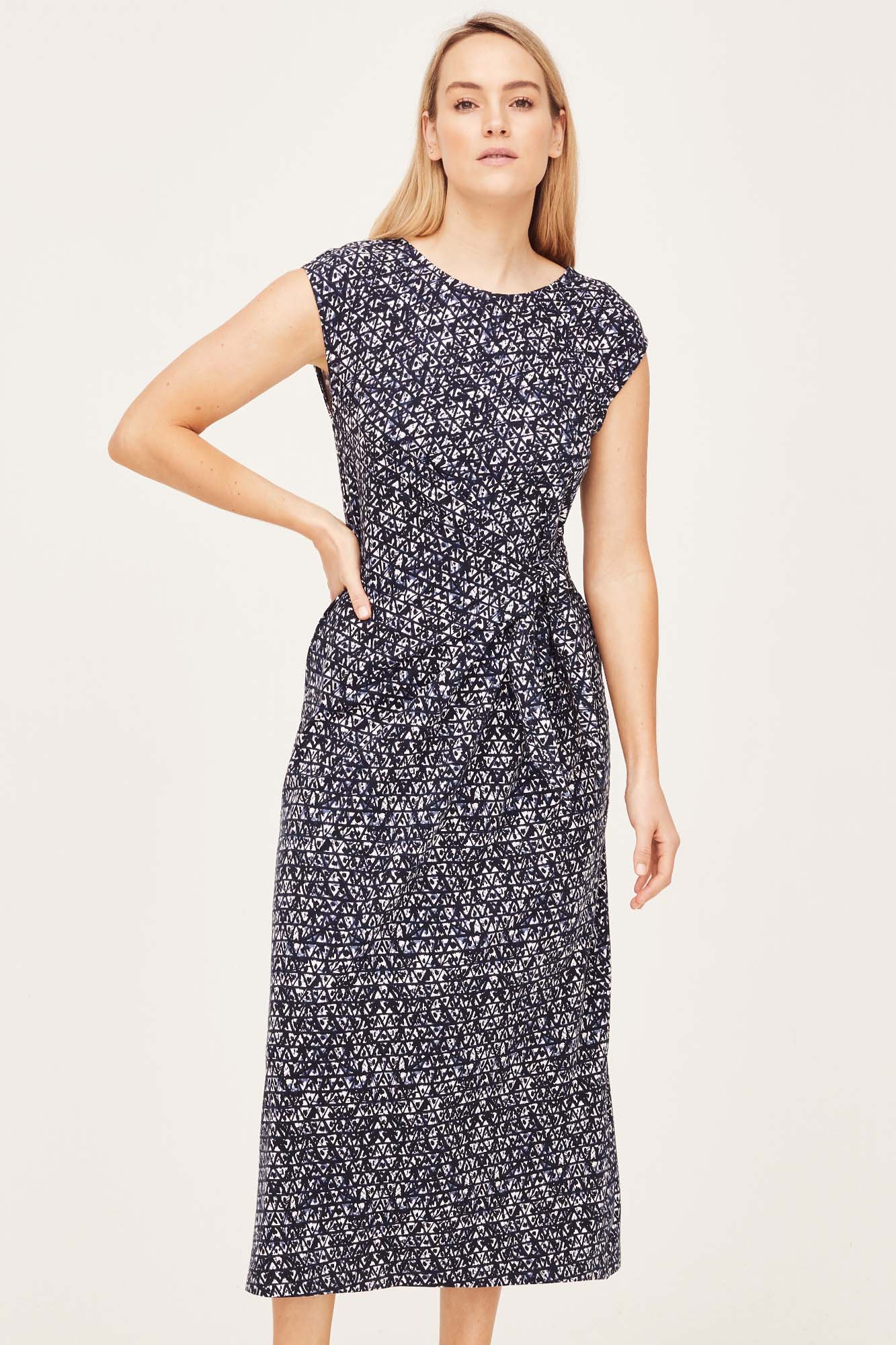 Μακρυ αμανικο ζερσει φορεμα με print tone-in-tone σε μπλε σκουρες αποχρωσεις απο ανωτερης ποιοτητας απαλο και ιδιαιτερα ελαστικο υφασμα της Thought που αναπνεει και ειναι φιλικο προς το δερμα. Εχει χαλαρη εφαρμογη, σμιλευει και μακραινει τη σιλουετα, δενει στο πλαι στη μεση ωστε να προσαρμοζεται στο σωμα και εχει κοντα cap-sleeves. Ιδανικο για την πολη καθως δεν χρειαζεται σιδερωμα. Tο μακρος του ειναι περιπου 130cm. Spring-Summer collection. Συνθεση: 97% Πιστοποιημενο Οργανικο Βαμβακι, 3% Elastane.