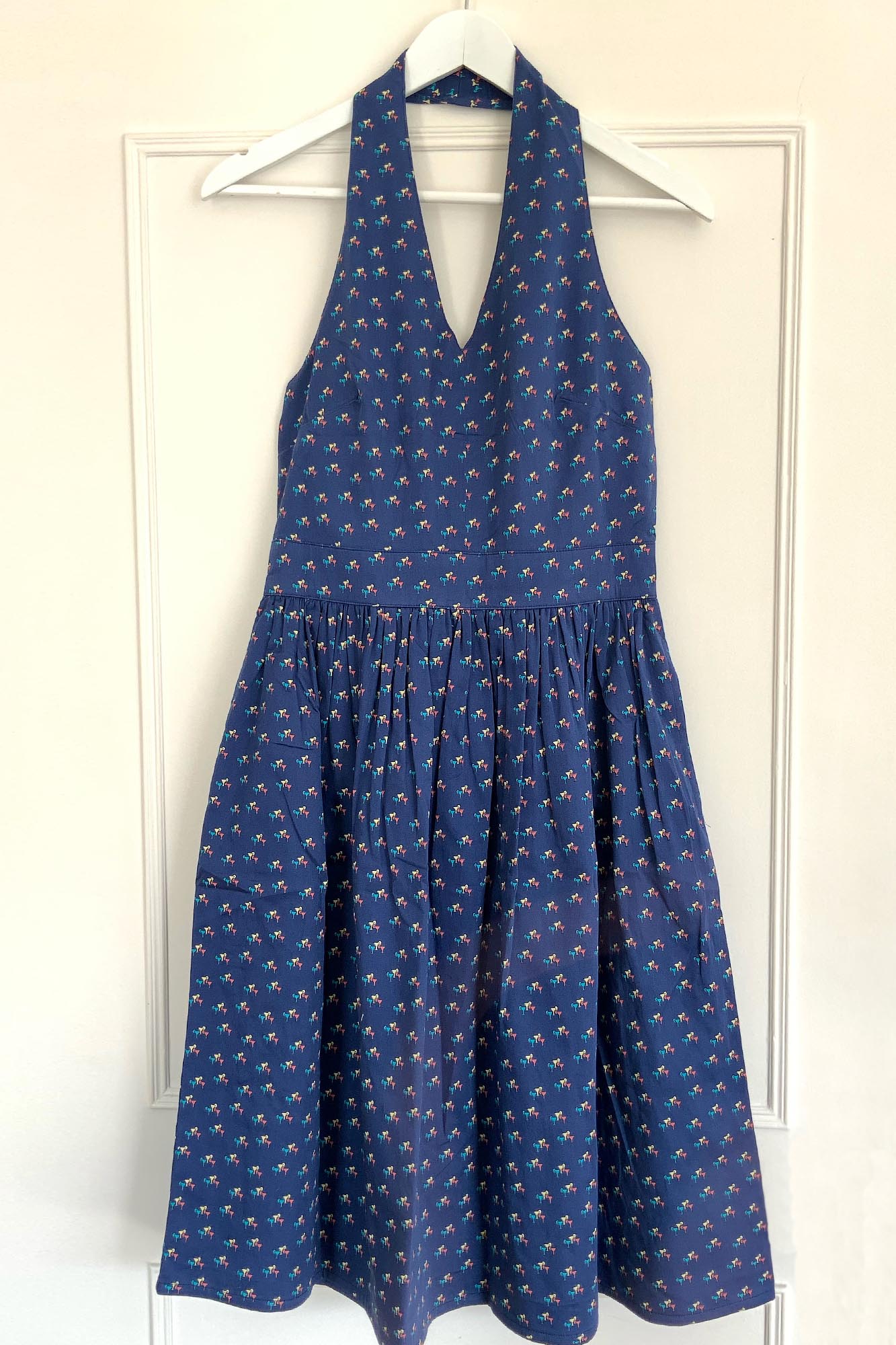 Εξωπλατο βαμβακερo μπλε halter-neck φορεμα με print κοκτέιλ ποτηρακια. Απαλο και δροσερο απο στιλπνο βαμβακερο υφασμα εφαρμοζει στο σωμα και τη μεση και καταληγει σε φουστα με ψιλες πιετες που κολακευει χωρις να φουσκωνει. Ιδανικο και για το βραδυ και για περιστασεις. Spring-Summer collection. Συνθεση: 100% Βαμβακι BCI (Better Cotton Initiative - το μεγαλυτερο προγραμμα βιωσιμοτητας βαμβακιου στον κοσμο).