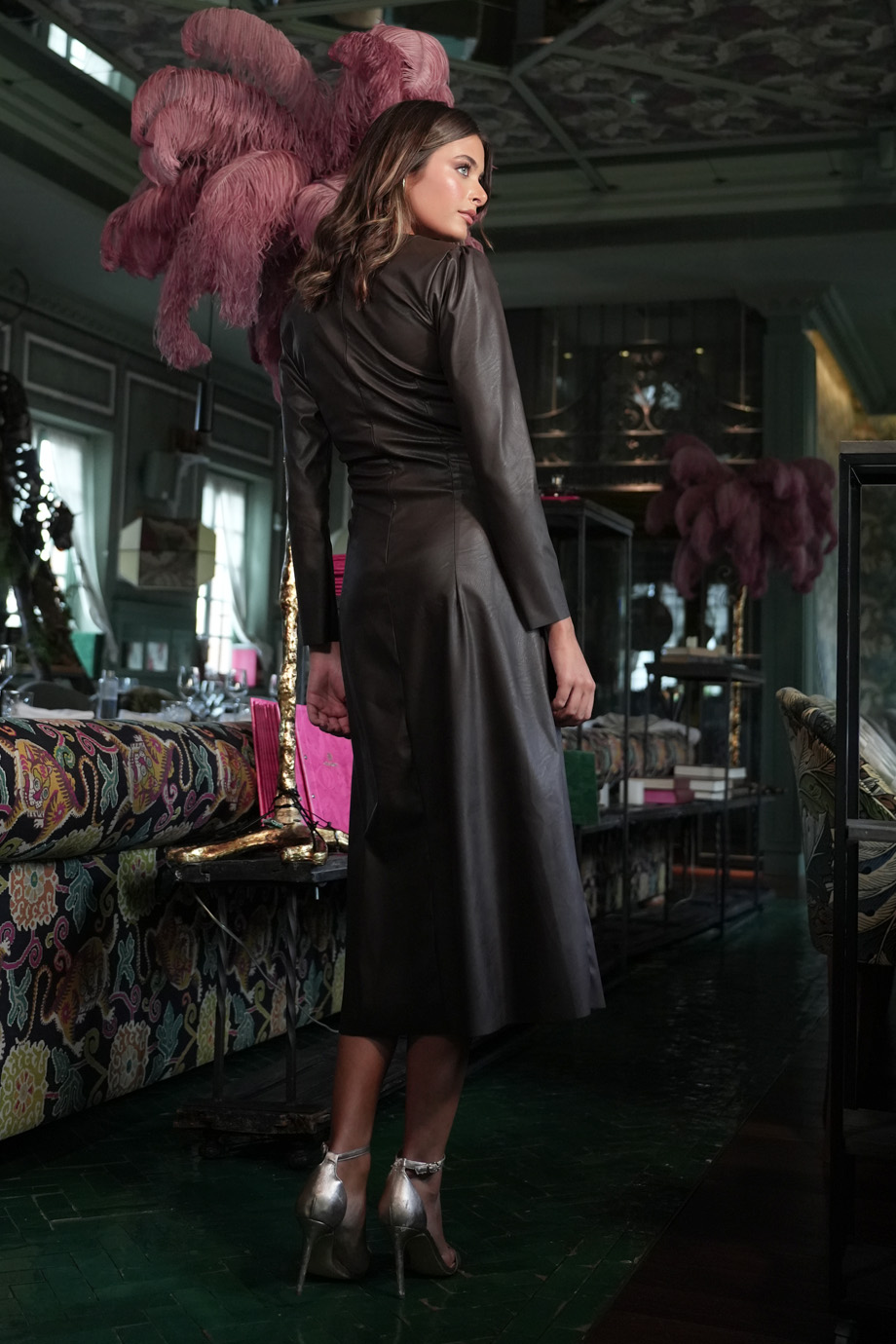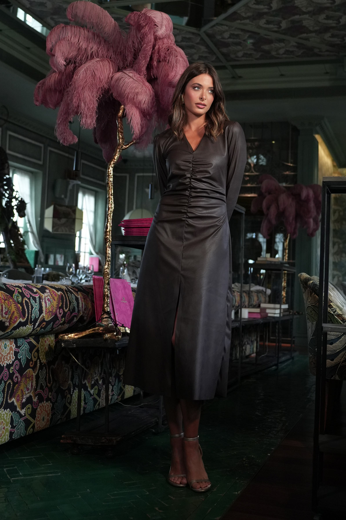 Μιντι φορεμα απο συνθετικο δερμα με ελαστικοτητα στο χρωμα της σοκολατας. Εχει "V" λαιμοκοψη που καταληγει σε σουρες στο μπροστινο μερος εως το ανοιγμα στα ποδια, συνδιαζοντας την ανεση αλλα και τονιζοντας τη θηλυκη σιλουετα. Το μοντελο φοραει XSmall και εχει υψος 1.76cm. New Autumn-Winter 2025 collection. 90% Polyester, 10% Elastane/Spandex. Κατασκευαζεται στην Ισπανια.