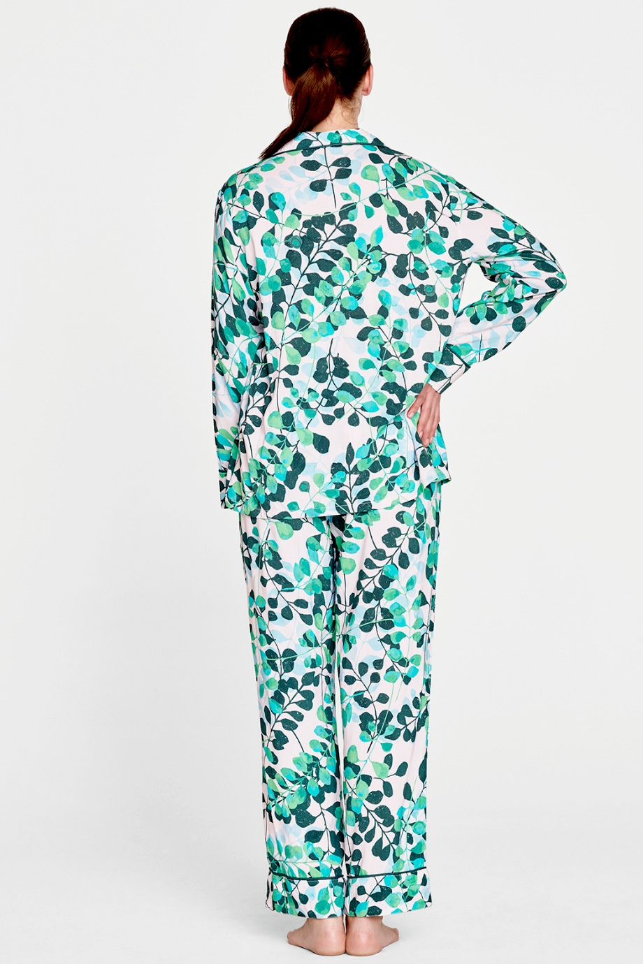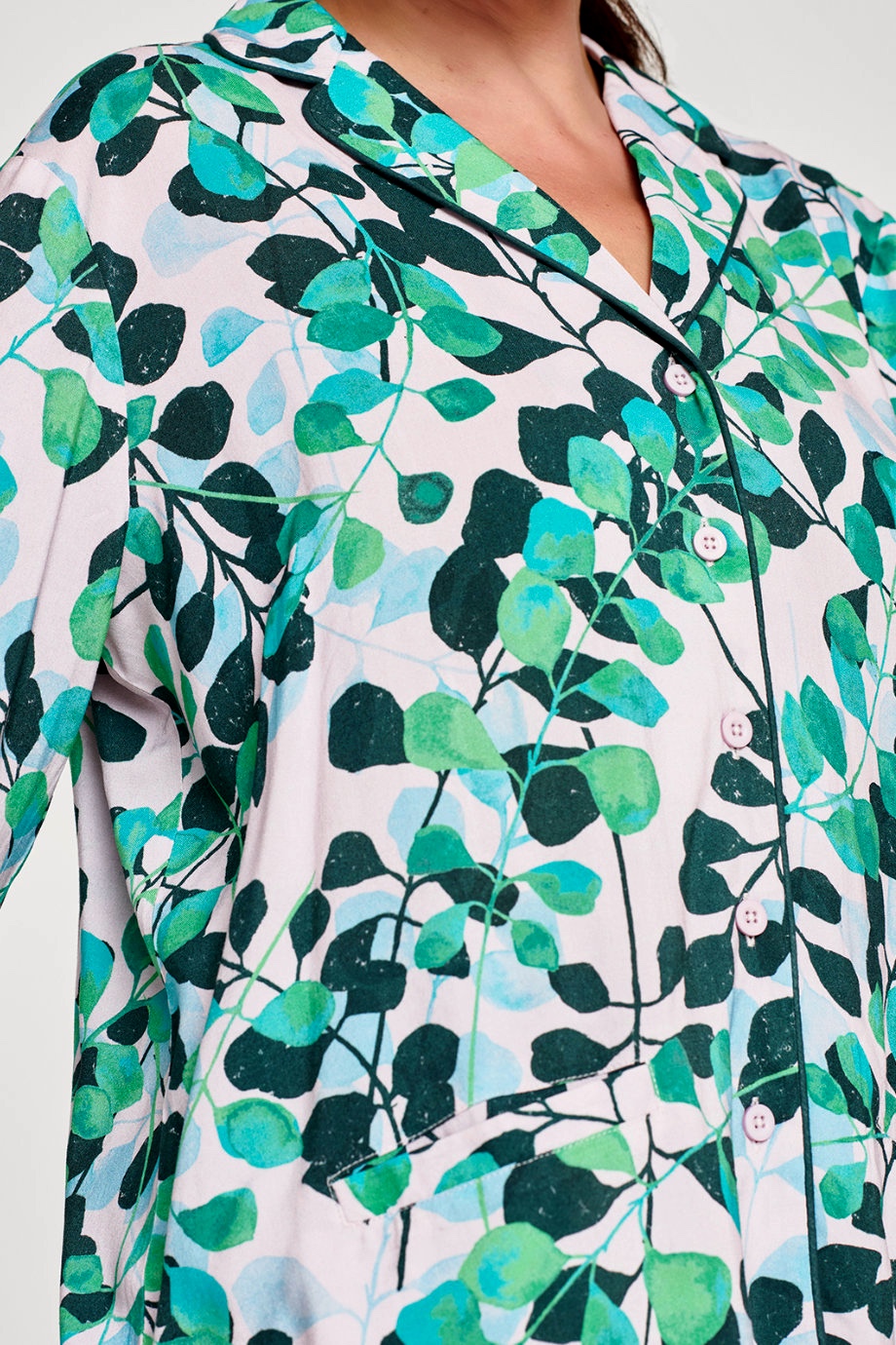 Σετ φανελενια πιτζαμα απο πιστοποιημενο οργανικο βαμβακι GOTS (δηλαδη περιοριζει τη χρηση τοξικων λευκαντικων και αλλων χημικων κατα την παραγωγη του) με μακρυμανικο πουκαμισο και παντελονι, σε υφασματινη θηκη ιδανικη για ταξιδια και για δωρο. Εχει print εμπνευσμενο απο τη φυση, υπεροχη αισθηση στο σωμα και το αφηνει να "αναπνεει". Συνθεση: 100% Πιστοποιημενο Οργανικο Βαμβακι GOTS