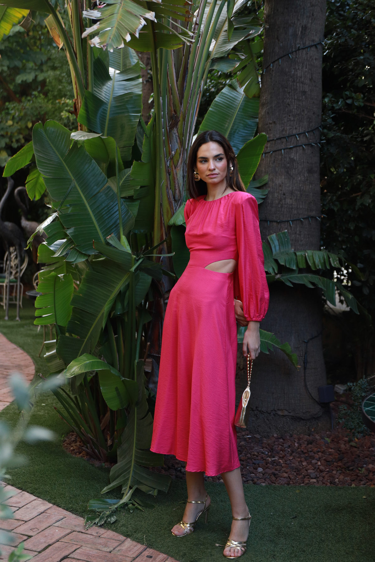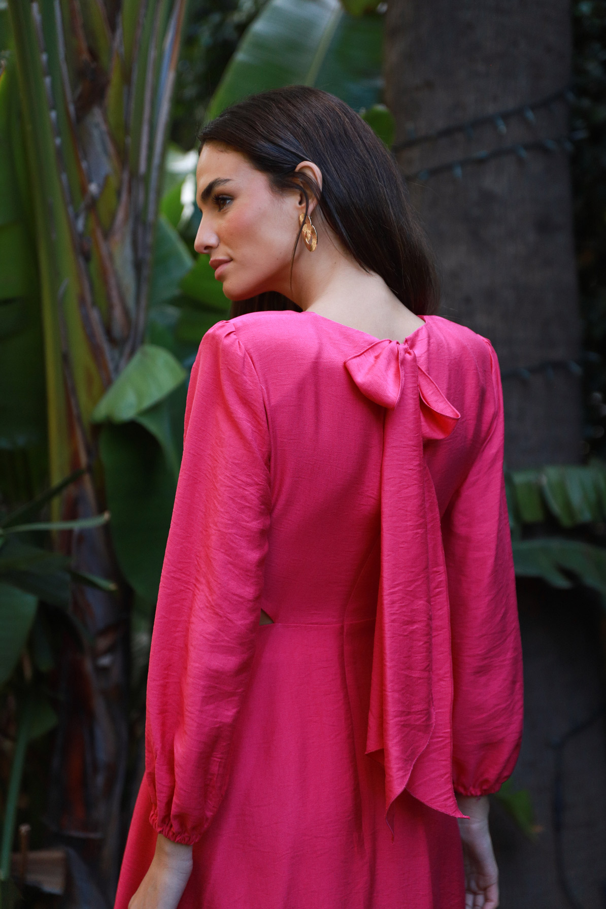 Μιντι φορεμα σε εντονο φουξια χρωμα απο λεπτο, αερινο υφασμα του ισπανικου brand name CAYRO εξαιρετικη επιλογη για περιστασεις, βαφτισια και γαμους. Εχει υπεροχη εφαρμογη, εβαζε φουστα και πλαινα ανοιγματα στη μεση, βατες στους ωμους και δενει πισω στην πλατη με φιογκο. Spring-Summer collection. 100% Polyester. Κατασκευαζεται στην Ισπανια.