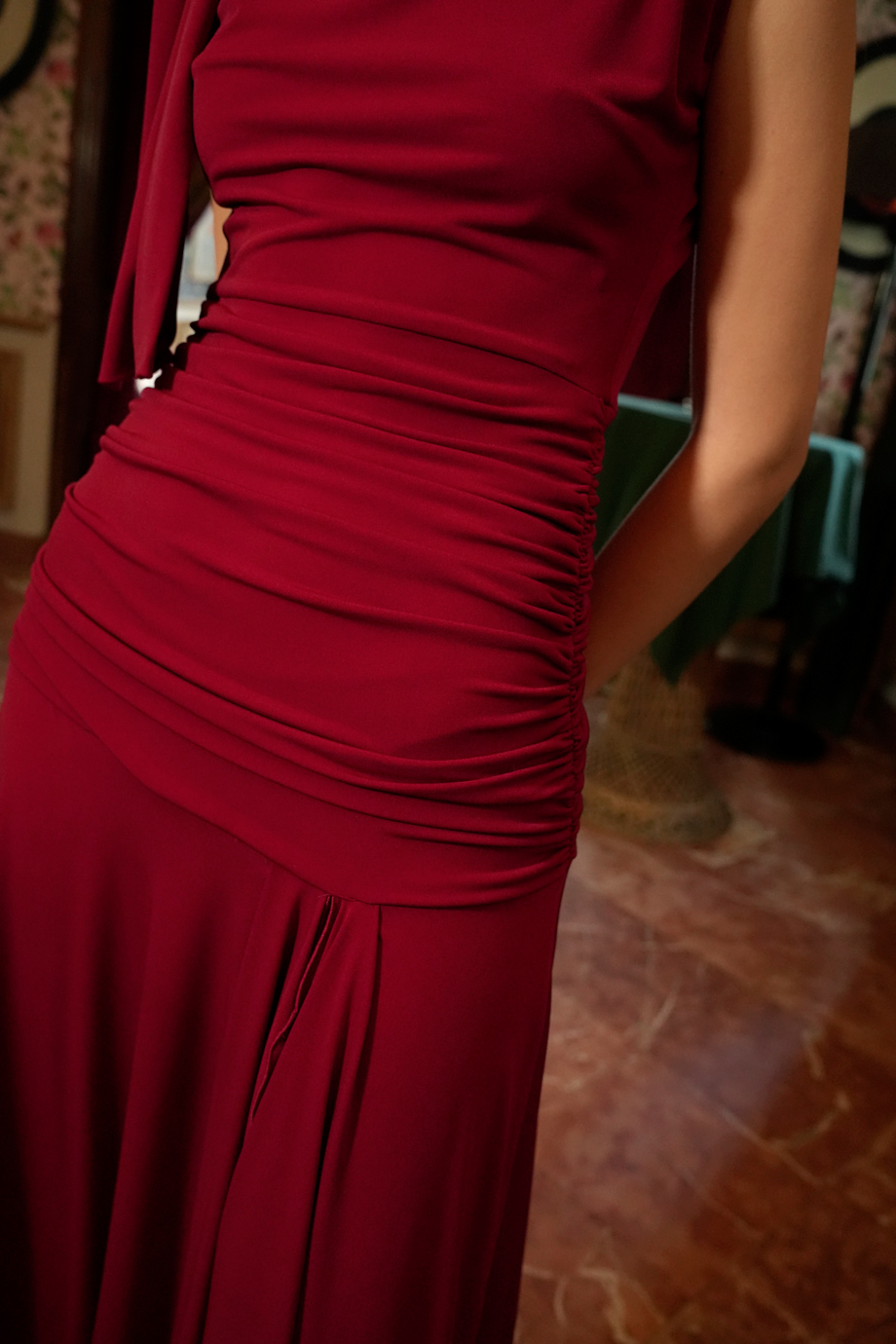 Μιντι φορεμα ιδανικο για περιστασεις, βαφτιση ή γαμο σε μπορντο-κοκκινο χρωμα απο jersey σαν μεταξωτο στην υφη υφασμα, απαλο και "ρευστο" που αναδεικνυει τη σιλουετα ενω ειναι ανετο. Εφαρμοζει τελεια διοτι διαθετει σχετικη ελαστικοτητα, με ντραπε λεπτομερεια στο σωμα, βατες στους ωμους με χρυση αγκραφα-κοσμημα και μιντι φουστα σε Α-γραμμη με ανοιγμα στο ποδι που καταληγει σε μυτες που χαριζουν στην κινηση. Το μοντελο ειναι 1.70 και φοραει XSmall. New Spring-Summer 2026 collection. Συνθεση: 100% Polyester. Κατασκευαζεται στην Ισπανια.