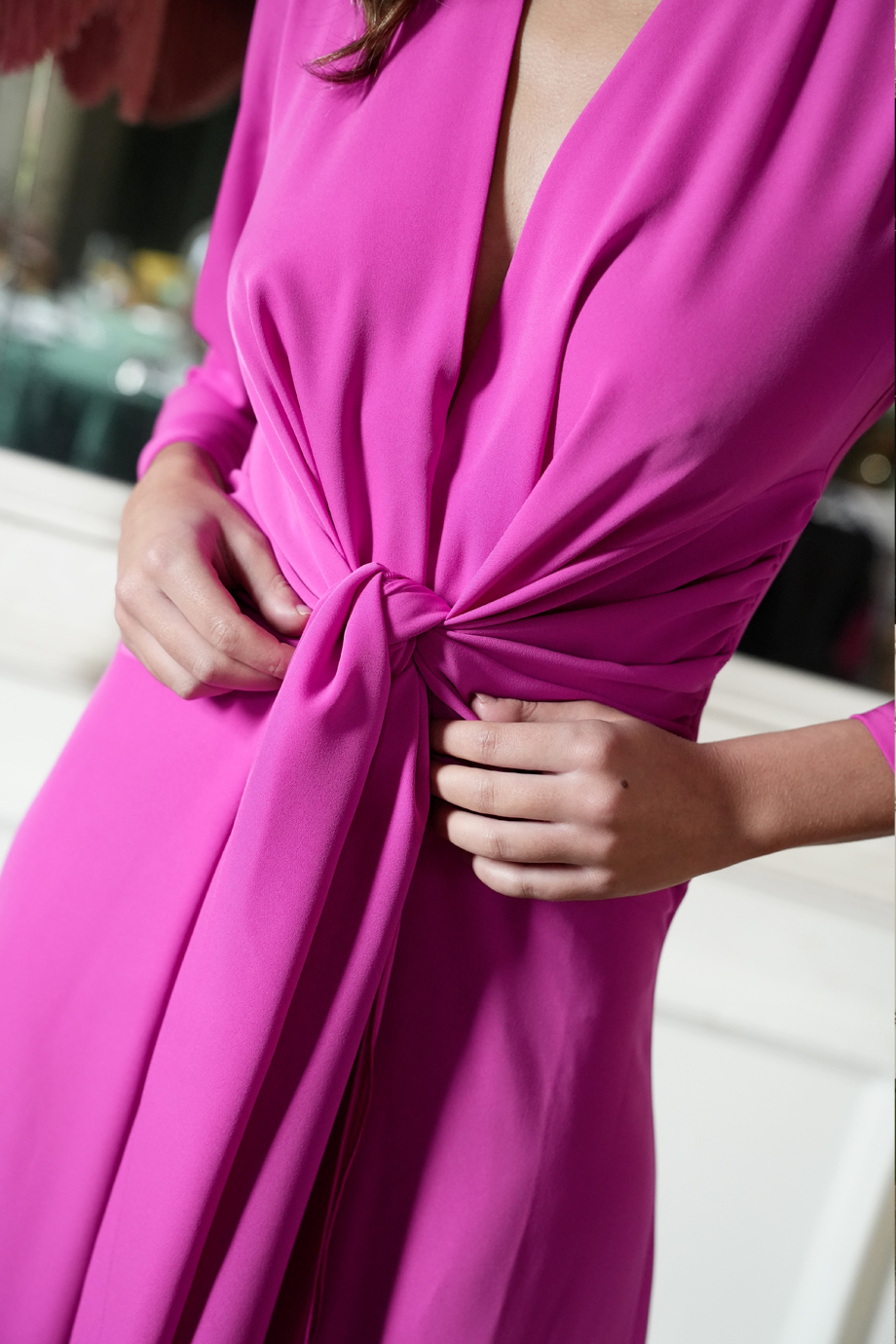 Μιντι φορεμα απο κρεπ υφασμα στο χρωμα της βουκαμβιλιας ιδανικο για περιστασεις, βαφτισεις και γαμους. Εχει V-λαιμοκοψη, προσαρμοζεται στο σωμα με μπροστινο δεσιμο και καταληγει σε αναλαφρη εβαζε φουστα. Το μοντελο ειναι 1.76 και φοραει XSmall. New Spring-Summer 2026 collection. Συνθεση: 100% Polyester. Κατασκευαζεται στην Ισπανια.