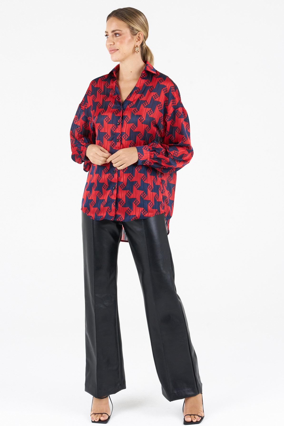 Κοκκινο πουκαμισο με μπλε σκουρο γεωμετρικο pied de coq pattern απο λεπτο αερινο υφασμα με διακριτικες λαμψεις στην υφανση. Ειναι σε φαρδια, ανετη γραμμη μακρυτερο πισω στην πλατη και το μοντελο φοραει XS. Autumn-Winter collection. Συνθεση: 100% PES. Autumn-Winter collection. Συνθεση: 100% Polyester.
