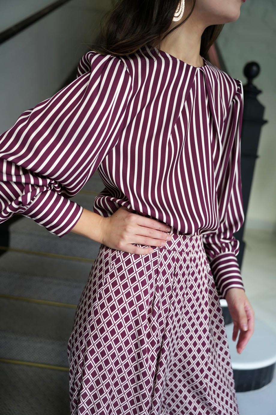 Μπλουζα ριγε μπορντο σε ισια γραμμη απο απαλο, χυτο υφασμα με μεταξενια υφη, ιδανικη για να ολοκληρωσετε μια κομψη εμφανιση με ιδιαιτερο στυλ. Εχει προσεγμενες λεπτομερειες οπως κουφοπιετα στη λαιμοκοψη, μανικια με ογκο που καταληγουν σε μεγαλες μανσετες με κουμπια. Το μοντελο φοραει XSmall. New Autumn-Winter 2025 collection. 100% Polyester. Κατασκευαζεται στην Ισπανια.