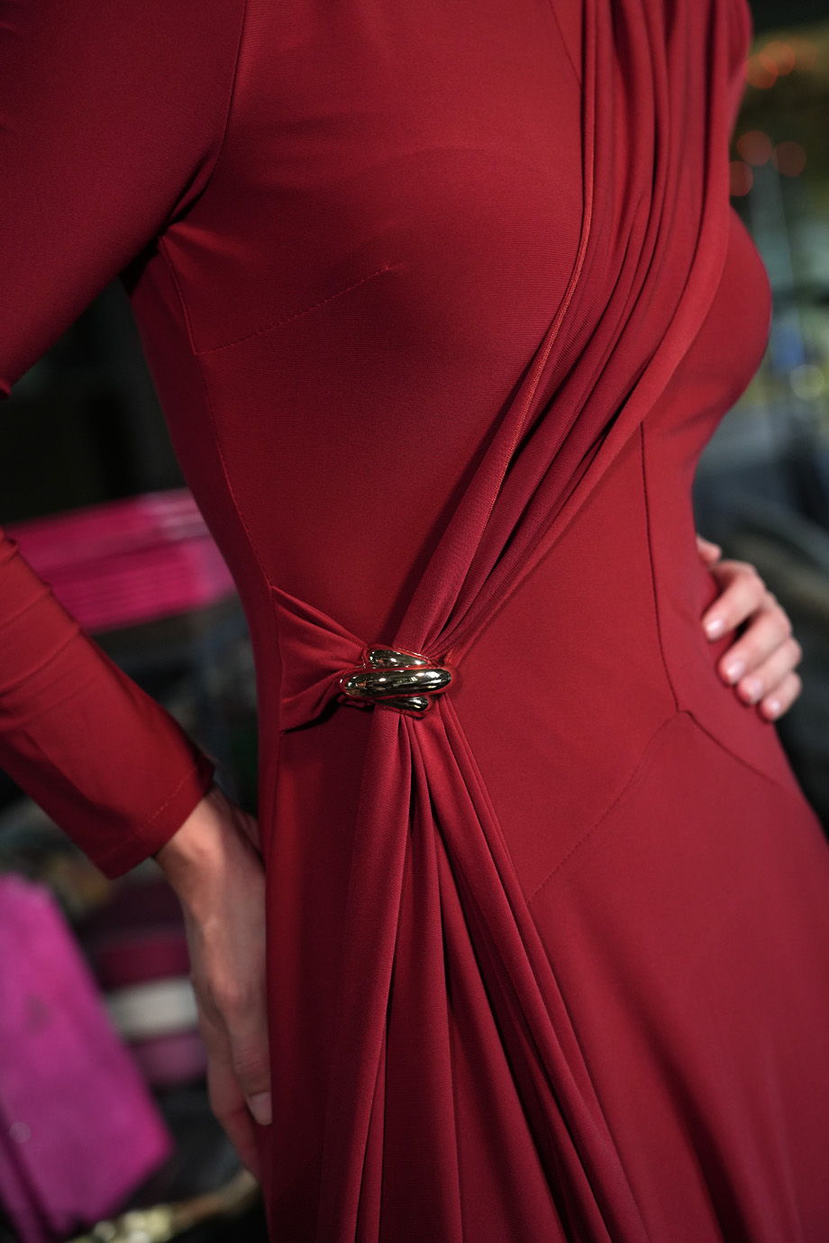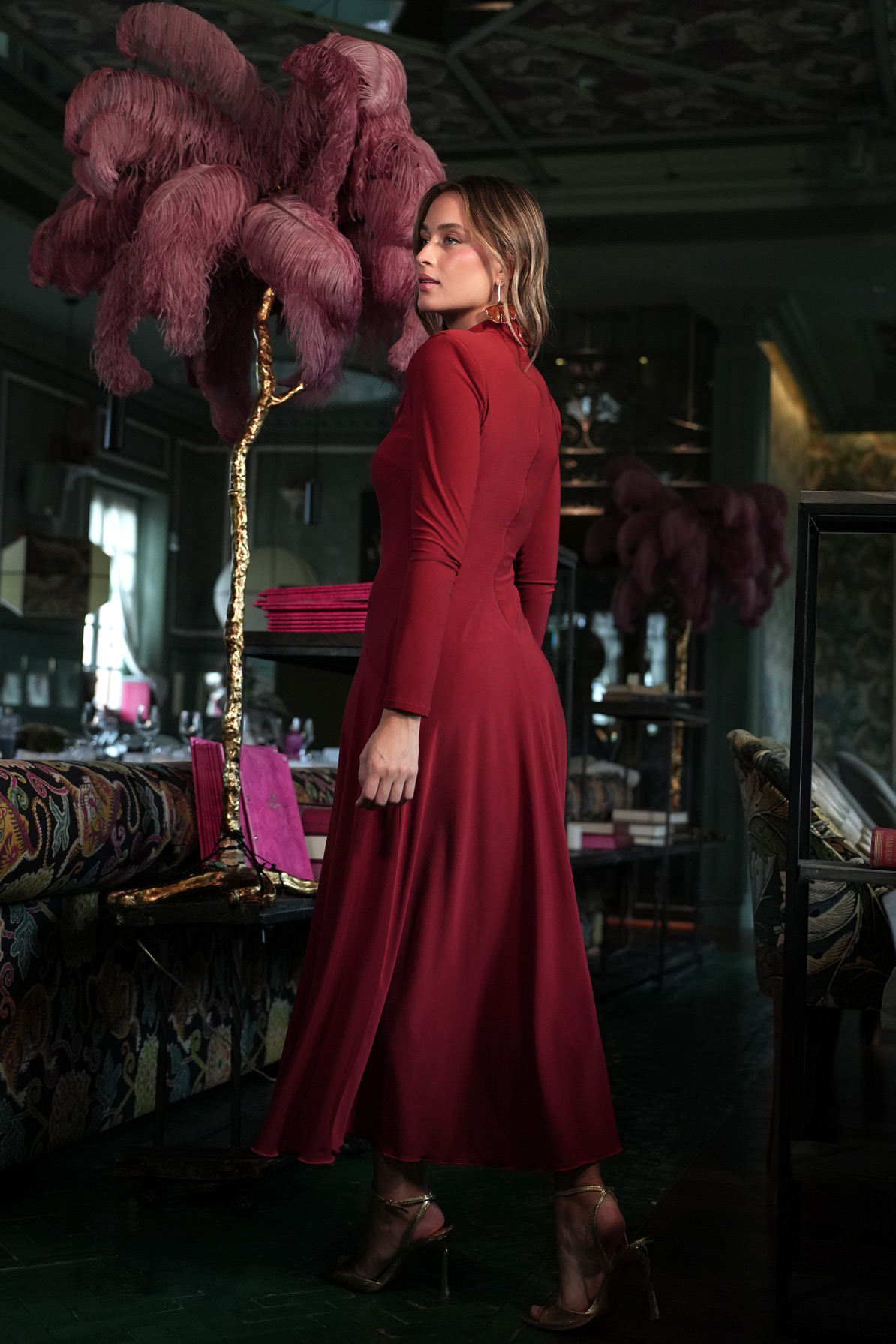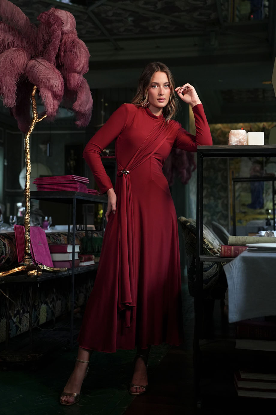 Μιντι φορεμα απο ελαστικο ζερσει υφασμα στο ζεστο χρωμα της τερακοτας. Εφαρμοστο στο σωμα με ρευστες, καθαρες γραμμες που χαριζουν στην κινηση, εχει εβαζε μιντι φουστα και ντραπε λεπτομερεια με χρυση αγκραφα. Εχει στρογγυλη λαιμοκοψη και εφαρμοστα μακρια μανικια. Το μοντελο φοραει XSmall και εχει υψος 1.68cm. New Autumn-Winter 2025 collection. 100% Polyester. Κατασκευαζεται στην Ισπανια.