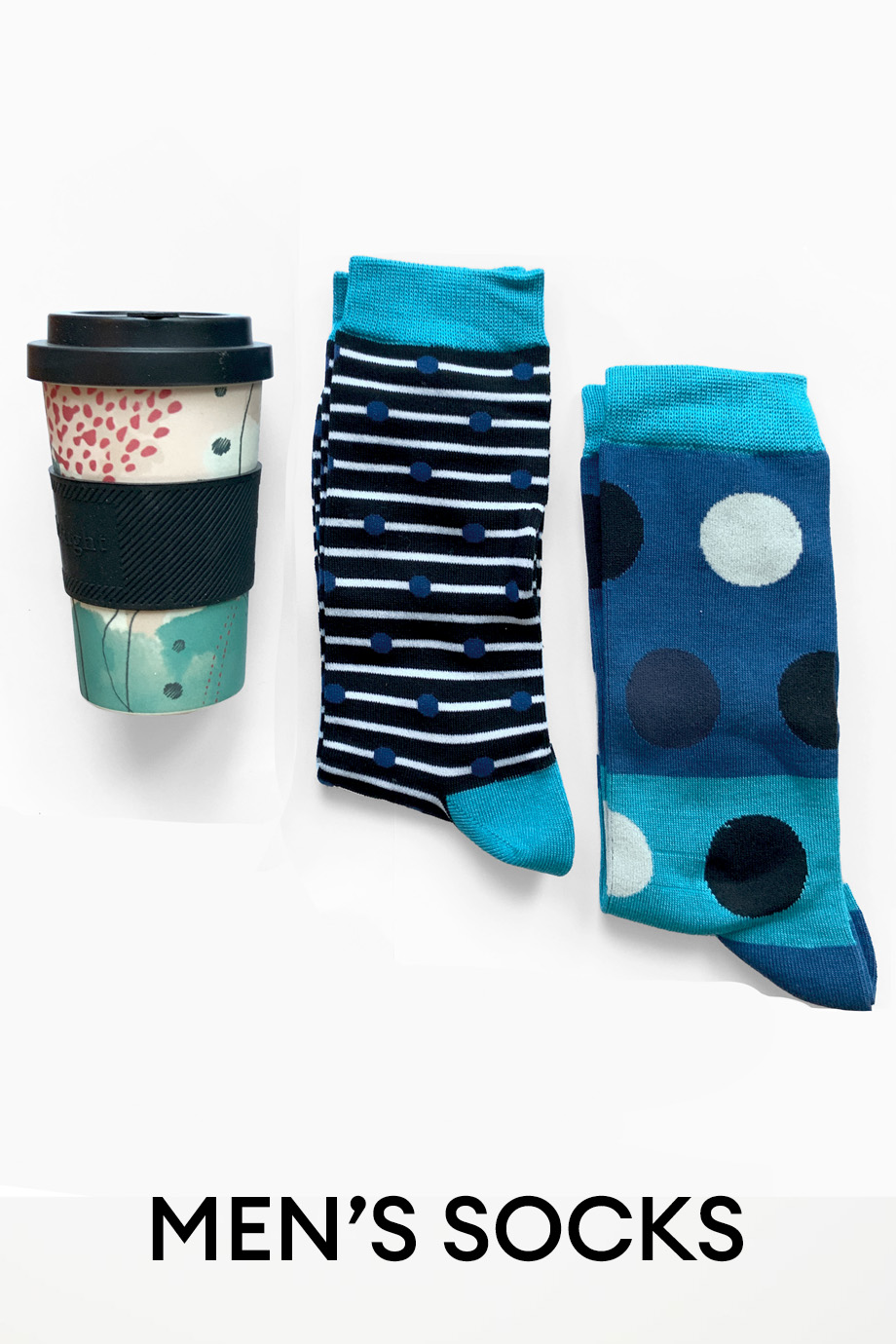 Σετ δωρου που περιεχει δυο ζευγαρια ανδρικες καλτσες και μια βιωσιμη κουπα για ροφημα. Οι καλτσες εχουν διαφορετικα ζακαρ σχεδια ειναι απο απαλο πιστοποιημενο οργανικο βαμβακι και βισκοζη απο μπαμπου, φυσικα αντιβακτηριδιακες, απαλες και ελαστικες. Συνθεση καλτσες: 54% Μπαμπου, 22% Πιστοποιημενο Οργανικο Βαμβακι, 22% Ανακυκλωμενο Πολυεστερ, 2% Elastane. Ειναι one size για μεγεθος παπουτσιου απο 40 εως 45.