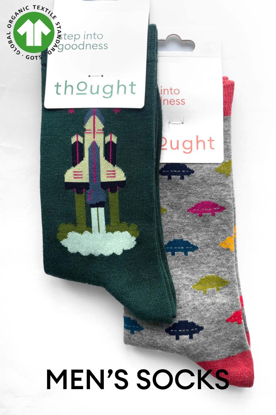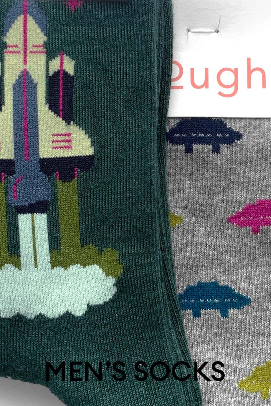 Δυο ζευγαρια ανδρικες καλτσες με ζακαρ διαστημοπλοιο και 80s video game. Ειναι απο ιδιαιτερα απαλο πιστοποιημενο οργανικο βαμβακι GOTS (δηλαδη που περιοριζει τη χρηση τοξικων λευκαντικων και αλλων χημικων κατα την παραγωγη του). Οι βιωσιμες καλτσες επιτρεπουν στο δερμα να αναπνεει ειναι φυσικα αντιβακτηριδιακες, ιδιαιτερα απαλες και ελαστικες. Ειναι one size για μεγεθος παπουτσιου απο 40 εως 45. Συνθεση: 78% Πιστοποιημενο Οργανικο Βαμβακι GOTS, 19% Ανακυκλωμενο Ναυλον, 3% Elastane.