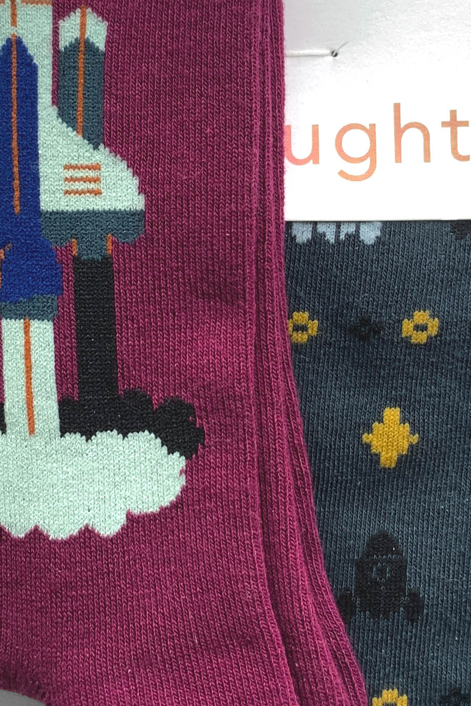 Δυο ζευγαρια ανδρικες καλτσες με ζακαρ διαστημοπλοιο και 80s video game. Ειναι απο ιδιαιτερα απαλο πιστοποιημενο οργανικο βαμβακι GOTS (δηλαδη που περιοριζει τη χρηση τοξικων λευκαντικων και αλλων χημικων κατα την παραγωγη του). Οι βιωσιμες καλτσες επιτρεπουν στο δερμα να αναπνεει ειναι φυσικα αντιβακτηριδιακες, ιδιαιτερα απαλες και ελαστικες. Ειναι one size για μεγεθος παπουτσιου απο 40 εως 45. Συνθεση: 78% Πιστοποιημενο Οργανικο Βαμβακι GOTS, 19% Ανακυκλωμενο Ναυλον, 3% Elastane.
