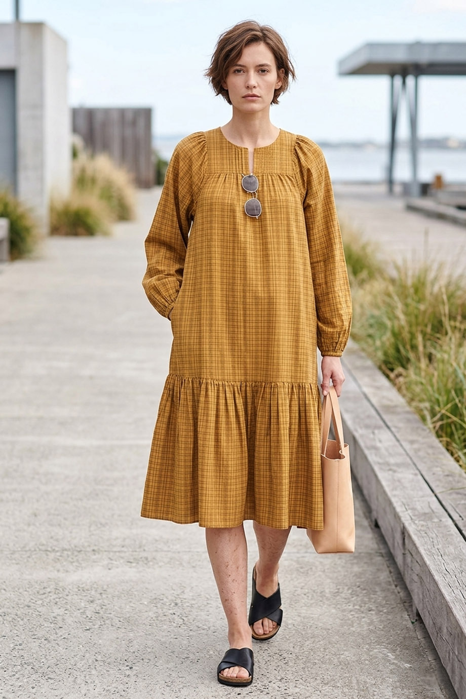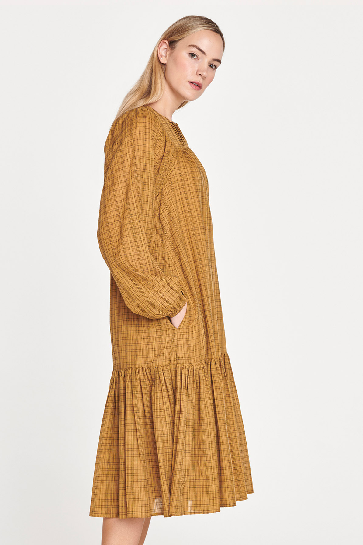 Φορεμα μιντι απο αναλαφρο βιολογικο βαμβακι που "αναπνεει" με καρο ζακαρ λεπτεπιλεπτο σχεδιο στην υφανση του - ενα νεο βιωσιμο υφασμα της Thought. Εχει χαλαρη εφαρμογη, ειναι σε Α-γραμμη με θηλυκο κοψιμο που κολακευει, κρυφο κουμωμα στο λαιμο και φουστα με διακριτικο βολαν που χαριζει στην κινηση με πλαινες τσεπες. Κουμπωνει πισω στην πλατη με μικρα υφασματινα κουμπακια. Το μακρος του ειναι περιπου 112cm και ειναι φοδραρισμενο με 100% Lenzing™ EcoVero™ (ενα ειδος βισκοζης που προερχεται απο πιστοποιημενες ανανεωσιμες πηγες ξυλου). Συνθεση: 100% Πιστοποιημενο οργανικο βαμβακι.