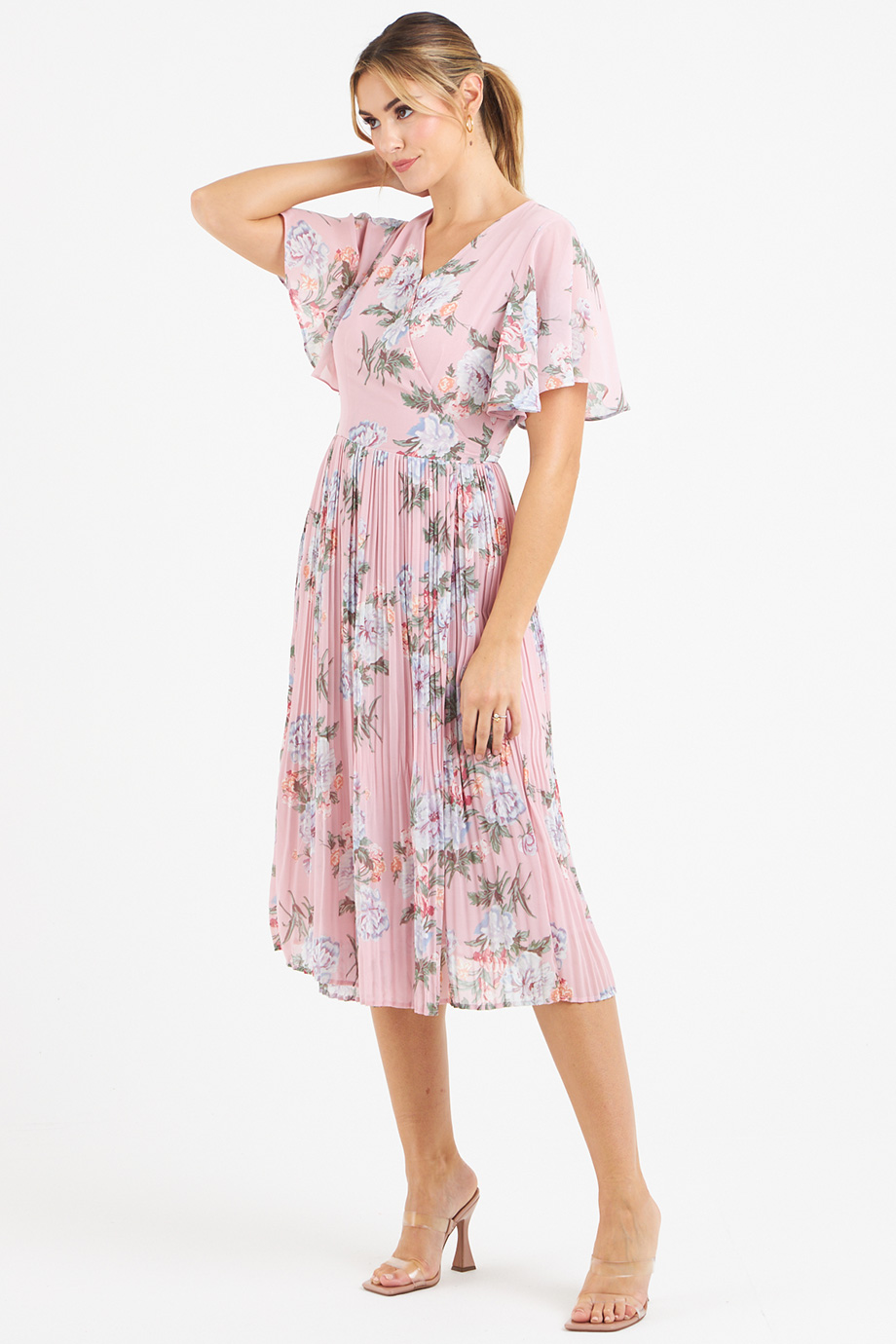 Κρουαζε αερινο ροζ φορεμα ιδιαιτερα θηλυκο απο λεπτο κρεπ chiffon υφασμα με ονειρεμενο floral. Προσαρμοζεται και αγκαλιαζει το σωμα, εχει αναλαφρα flare μανικια και καταληγει σε πλισε-soleil φουστα. Συνδιαστε με ψηλα πεδιλα για γαμο, βαφτιση και επισημες περιστασεις. Το μακρος του ειναι περιπου 118cm και το μοντελο φοραει XS. Spring-Summer collection. Συνθεση: 100% Polyester.