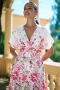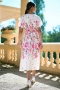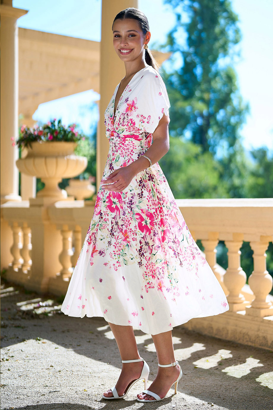 Ιβουαρ-λευκο αναλαφρο μιντι φορεμα με ροζ και λιλα λουλουδια απο δροσερη βισκοζη. Ειναι κρουαζε στο στηθος που καταληγει σε ρεγκλαν-κιμονο μανικια και κομψη εβαζε φουστα δημιουργοντας μια θηλυκη σιλουετα. Αερινο και λεπτο ειναι ιδανικο για περιστασεις, βαφτιση ή γαμο. Το μακρος του ειναι περιπου 130cm. New Spring-Summer 2026 collection. Συνθεση: 100% Βισκοζη.