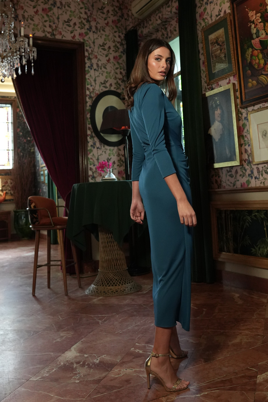Μιντι υπερκομψο φορεμα απο jersey σαν μεταξωτο στην υφη υφασμα ιδανικο για πολλες περιστασεις, βαφτισεις και γαμους. Εφαρμοζει τελεια στο σωμα διοτι διαθετει σχετικη ελαστικοτητα, εχει βατες στους ωμους και η φουστα διπλωνει μπροστα στη μεση με χρυση αγκραφα-κοσμημα. Το μοντελο ειναι 1.76 και φοραει XSmall. New Spring-Summer 2026 collection. Συνθεση: 100% Polyester. Κατασκευαζεται στην Ισπανια.