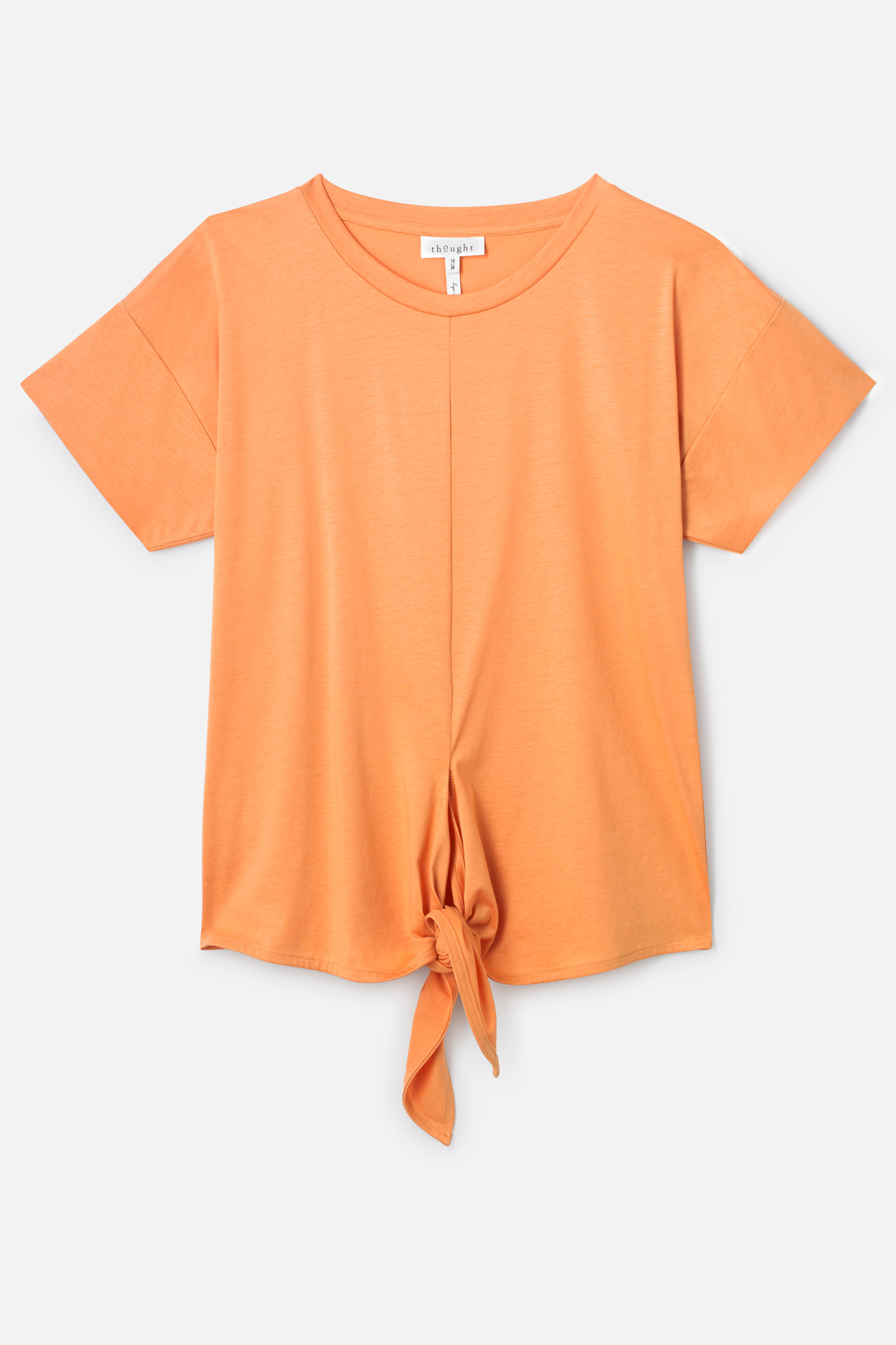 T-Shirt απο εξαιρετικης ποιοτητας μερσεριζε πιστοποιημενο οργανικο βαμβακι και Tencel™ σε υπεροχο πορτοκαλοκιτρινο του μαγκο, απαλo, δροσερο και φιλικo προς το δερμα, με δεσιμο στη μεση. Εχει απλη λαιμοκοψη, ανετη εφαρμογη και συνδιαζεται ιδανικα με εμπριμε φουστες και jeans. Το μακρος του ειναι περιπου 60cm. Spring-Summer collection. Συνθεση: 50% Μερσεριζε Jersey Οργανικο Βαμβακι, 50% Tencel™ (φυσικη ινα απο αποδομημενο ξυλο ευκαλυπτου).