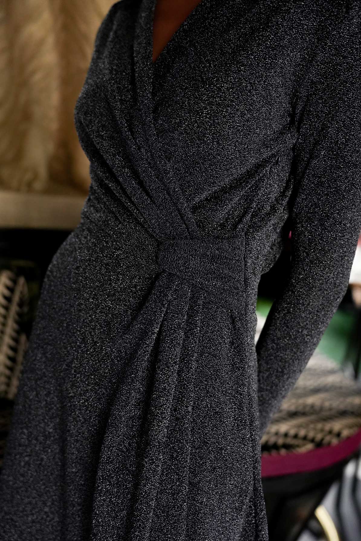 Βραδινο lurex μιντι φορεμα που αγκαλιαζει το σωμα και καταληγει σε εβαζε φουστα. Κρουαζε στο στηθος με ντραπε λεπτομερεια στη μεση, αναδεικνυει με φυσικο τροπο της καμπυλες. Εχει εφαρμοστα μακρια μανικια και ελαφρως τονισμενους ωμους. Το μοντελο φοραει XSmall και εχει υψος 1.76cm. New Autumn-Winter 2025 collection. Κατασκευαζεται στην Ισπανια.