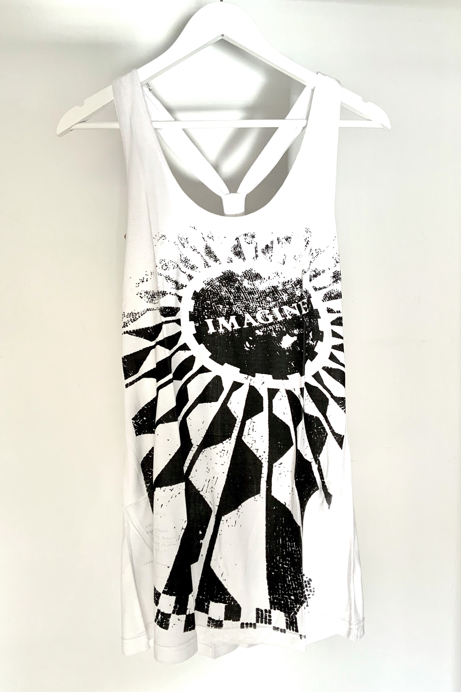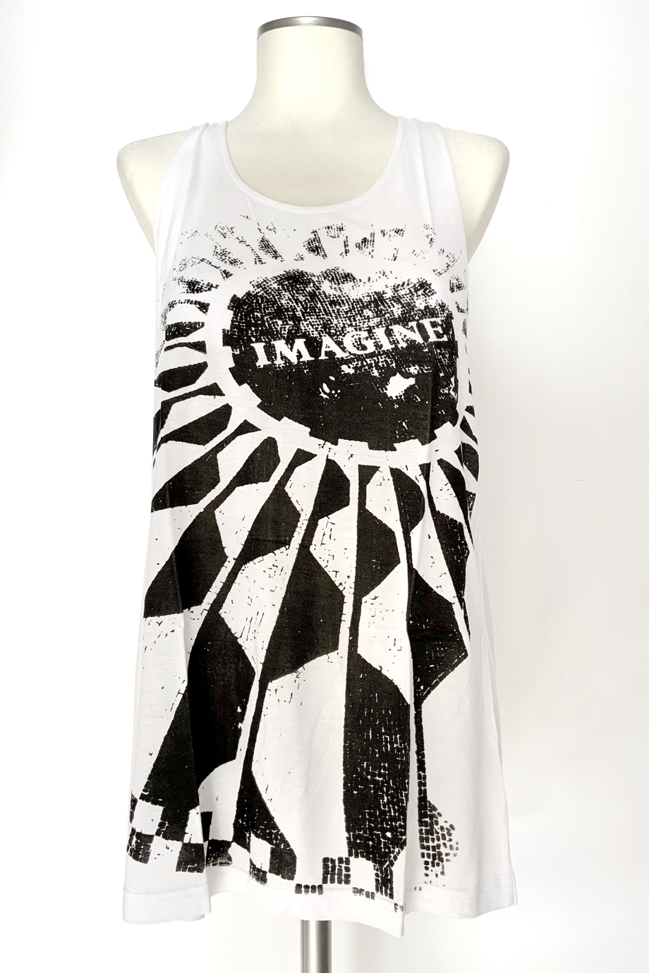 Εξωπλατο λευκο τοπ, super απαλο και δροσερο με photo-print εμπνευσμενο απο το τραγουδι του John Lennon "Imagine". Οι τιραντες δενουν πισω και εχει ανοιγμα εως κατω. Στο στηθος εχει διπλο υφασμα για να μπορει να φορεθει χωρις να ειναι διαφανες. Καθε ρουχο We Walk Australia ειναι τυπωμενο στο χερι και αυτο το κανει μοναδικο και ξεχωριστο. Summer collection. Συνθεση: 100% Rayon.