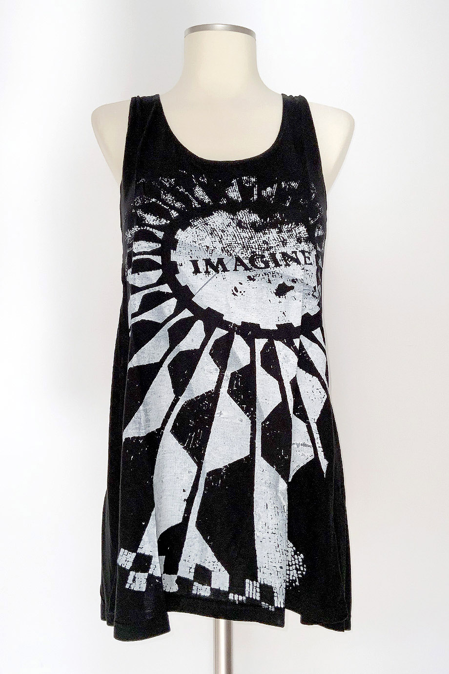Εξωπλατο μαυρο τοπ, super απαλο και δροσερο με photo-print εμπνευσμενο απο το τραγουδι του John Lennon "Imagine". Οι τιραντες δενουν πισω και εχει ανοιγμα εως κατω. Καθε ρουχο We Walk Australia ειναι τυπωμενο στο χερι και αυτο το κανει μοναδικο και ξεχωριστο. Summer collection. Συνθεση: 100% Rayon.